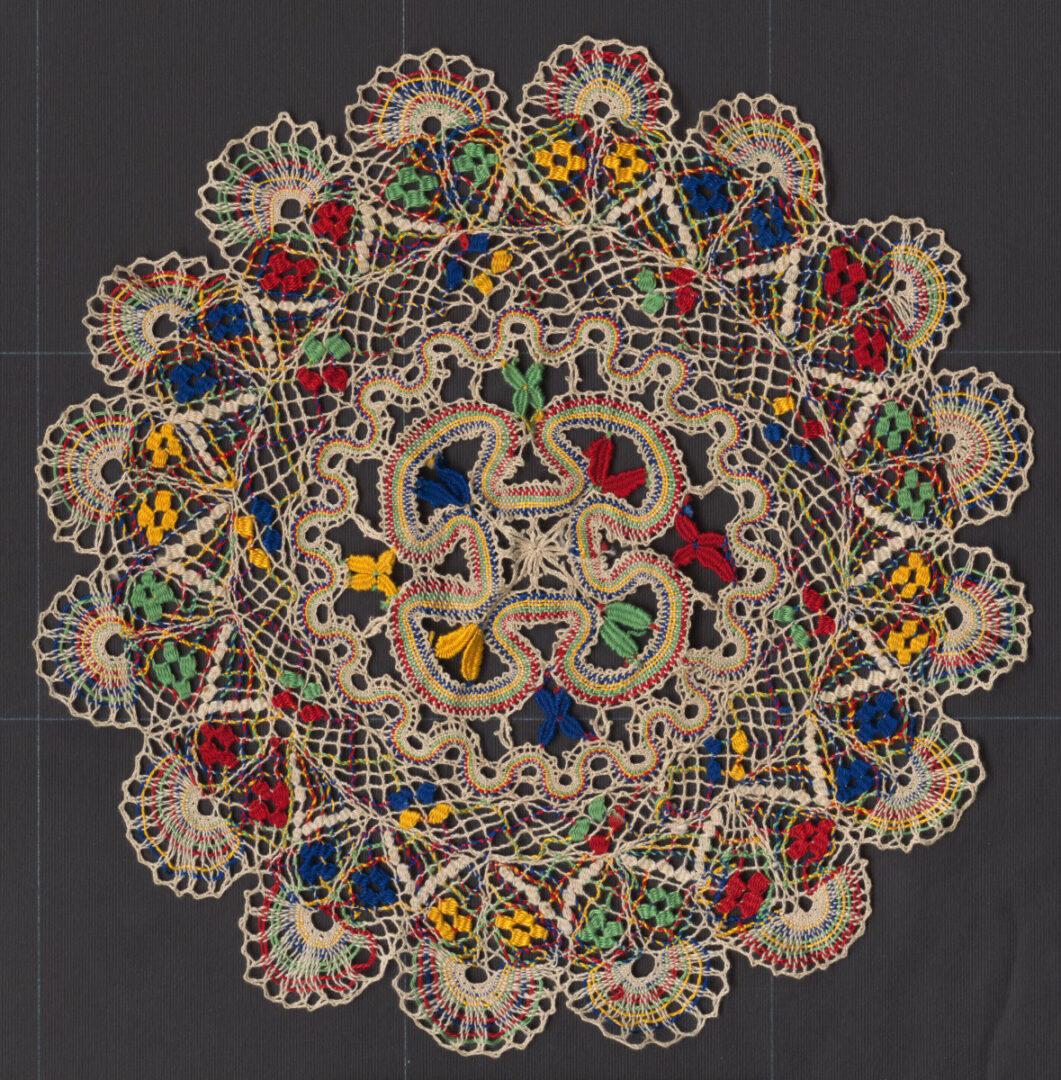 Prikrývka z paličkovanej čipky, typická pre Soľnú Baňu. Bavlnená nebielená niť a pestré bavlnky na vyšívanie. Väzby jedno a dvojpárové pletence, plátenko, dierky, lístky, ploštičky.