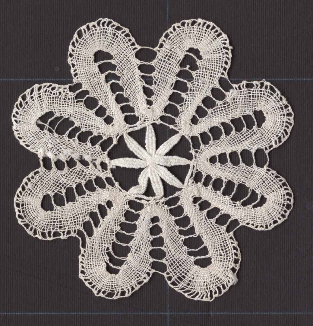 Motív z paličkovanej čipky. Materiál biela bavlnená niť na šitie, väzby jedno a dvojpárové pletence, plátenko a lístky.
