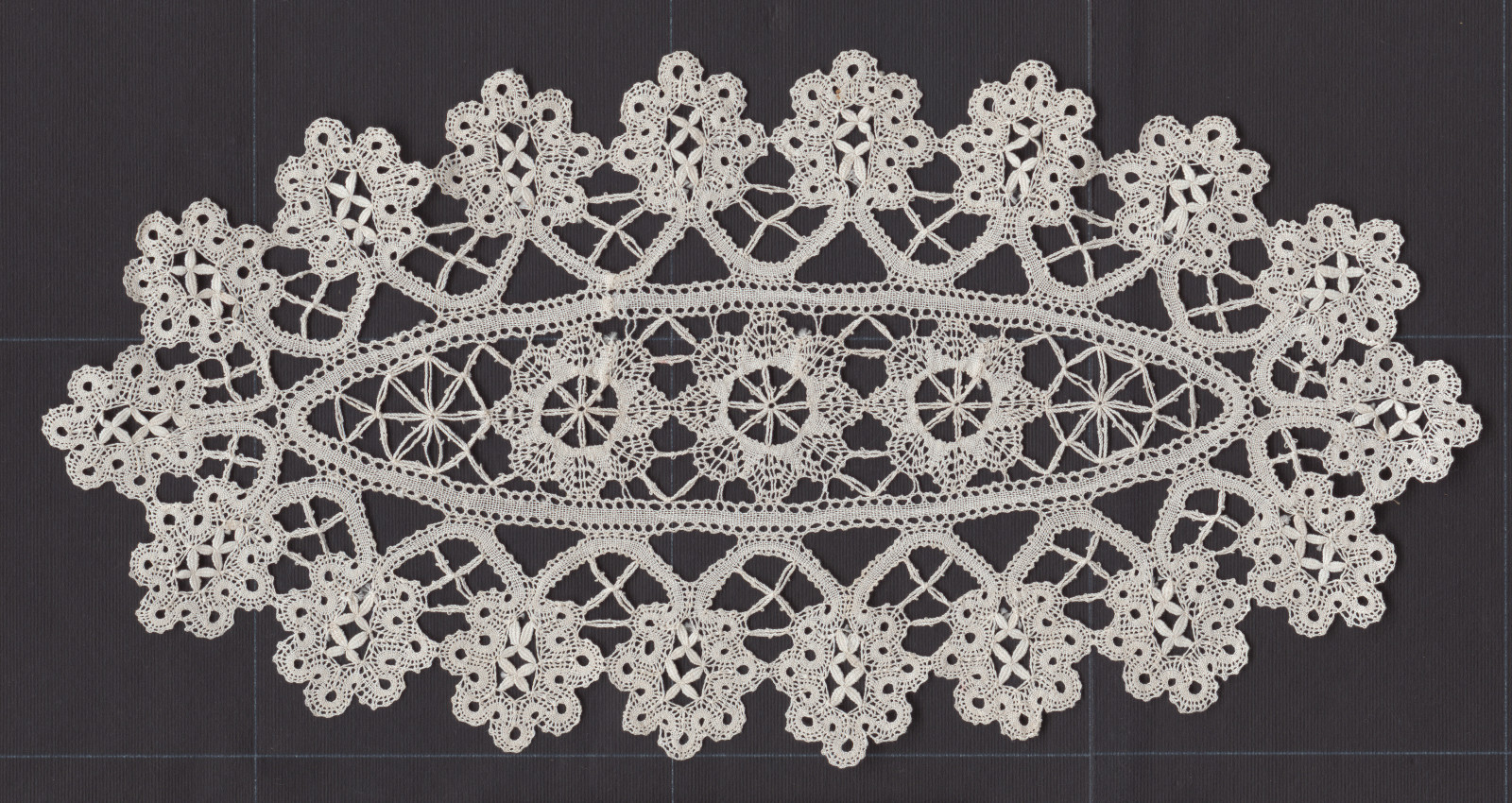 Prikrývka z paličkovanej čipky z bielej bavlnenej nite. Väzby dvojpárové pletence, plátenko hladké a prekladané, lístky a pikotky/mitky.