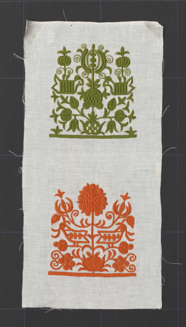 Dva rôzne motívy vyšité na jednom kuse ľanového plátna. Výšivky podľa predkresleného vzoru zobrazujú štylizovaný rastlinný motív vyrastajúcu z jablka, po stranách sú umiestnené vtáčiky. Motívy sa používali na obradových šatkách v Prievidzi.