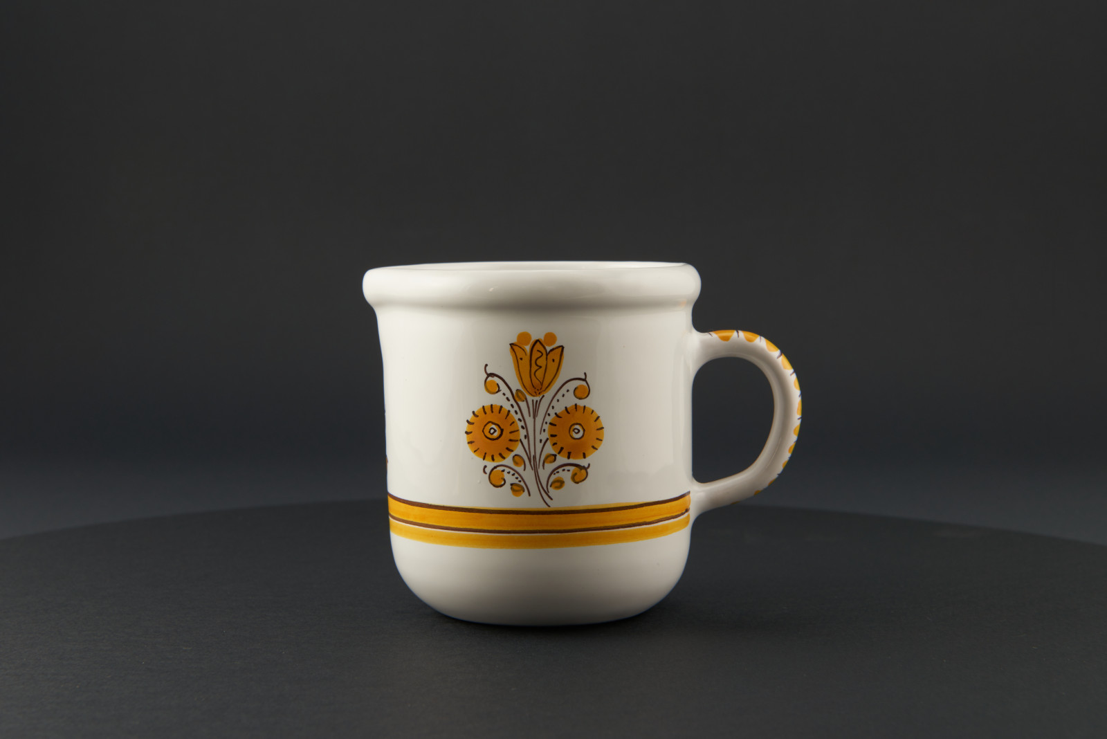 Nádobka na mlieko keramická, majoliková, točená na kruhu, s nálievkou a uškom. Dekor: po stranách kvetinový motív (kytička z troch kvetov), žltý pásik na spodnej časti. Farebnosť: žltý dekor, hnedá kontúra, biela glazúra.