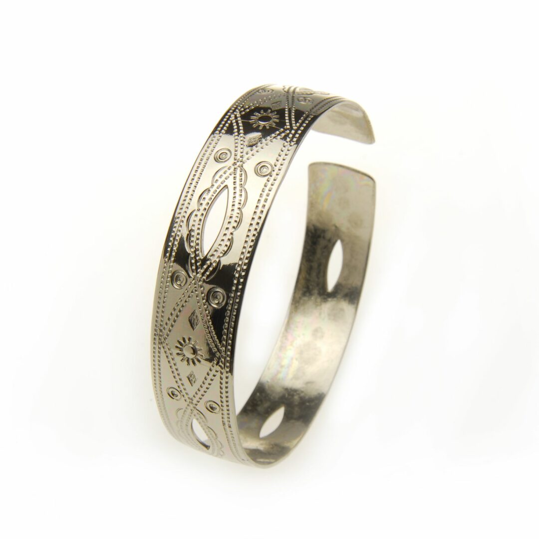Náramok užší je zdobený tepaním a vyhotovený z alpaky.
