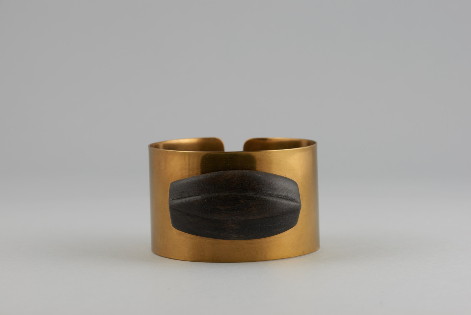Mosadzný široký náramok s otvorom, zdobený orechovým ručne vyrezávaným drevom.