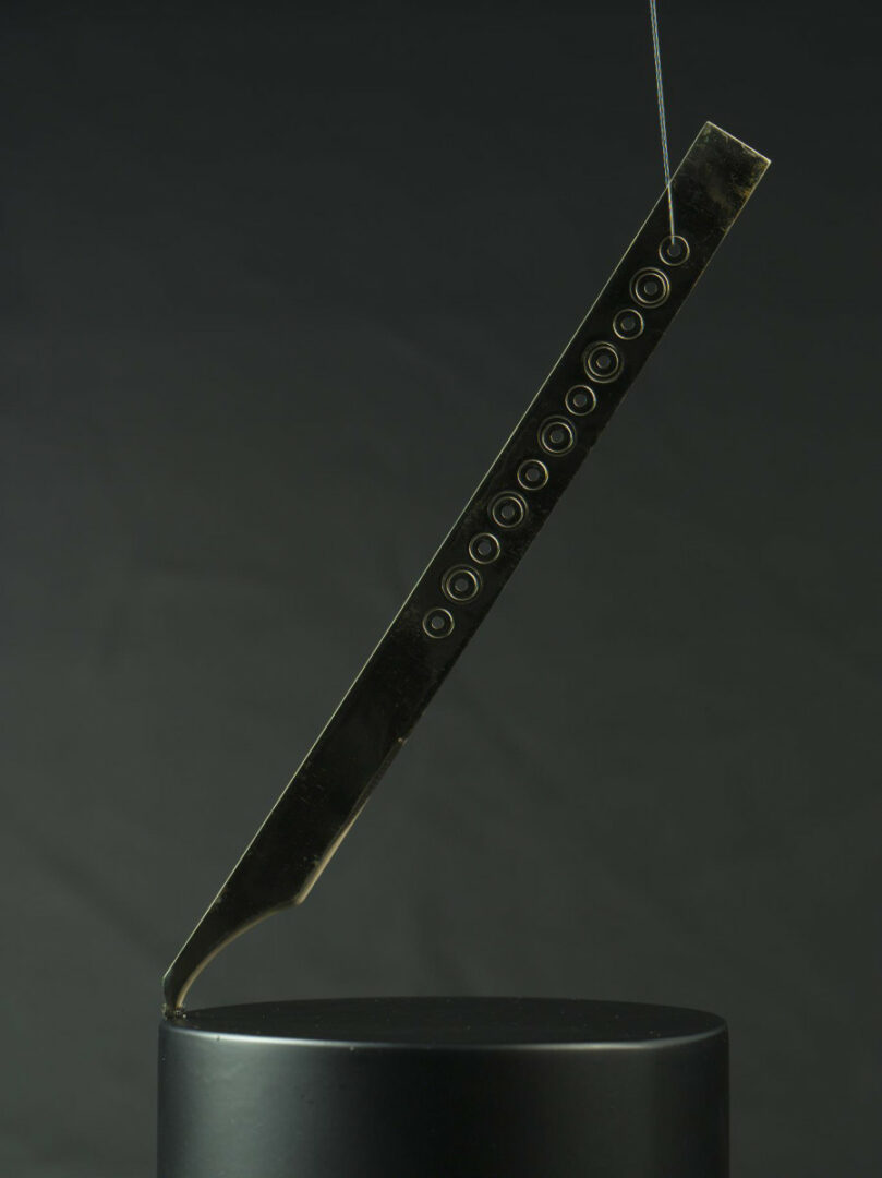 Nôž na listy vyrobený z alpaky. V mieste rúčky je kov perforovaný (dierka v krúžku).