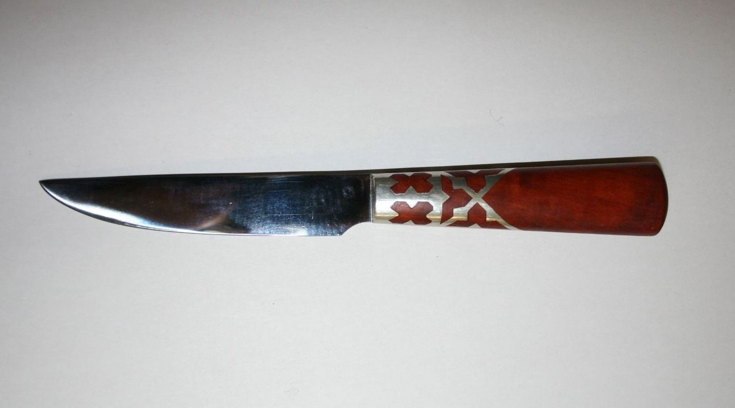 Nôž pastiersky má drevenú rúčku vylievanú kovom.