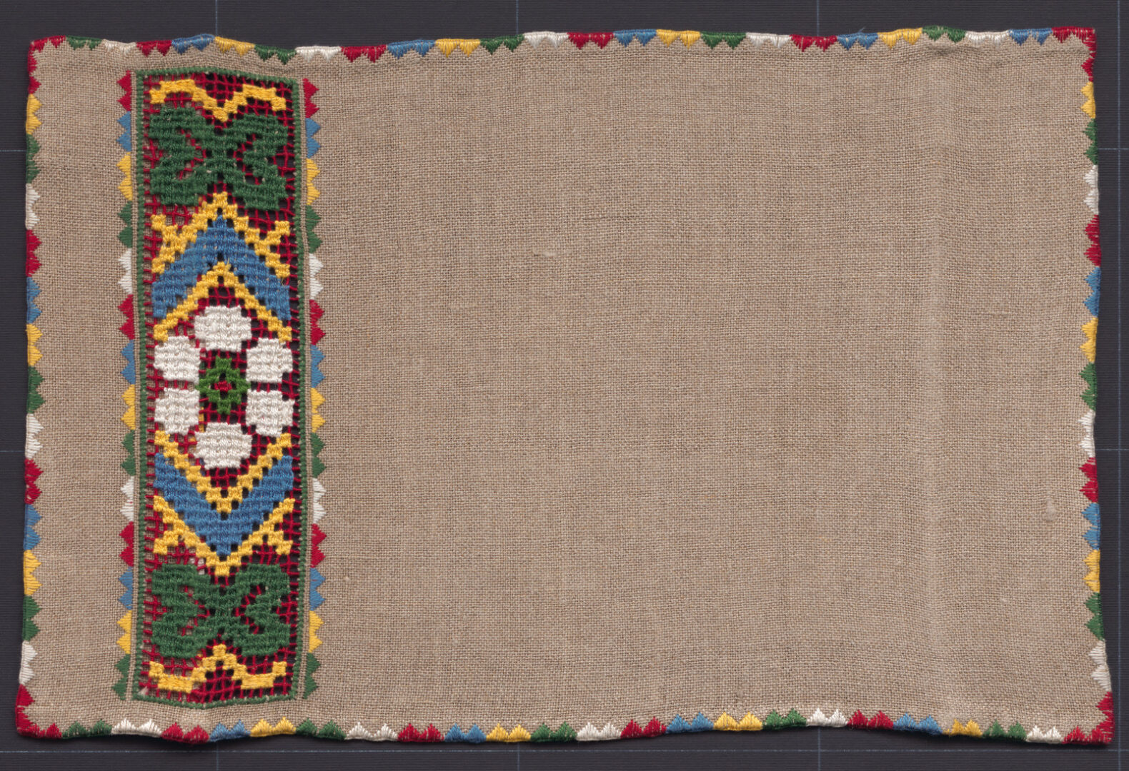 Obal na knihy, nebielené ľanové plátno (torlonia) vyšité perlovkami rôznej farby. Výšivka je počítaná, zhotovená v sieti po nitiach, stehy hladkovanie, slučkovanie a krížiky.