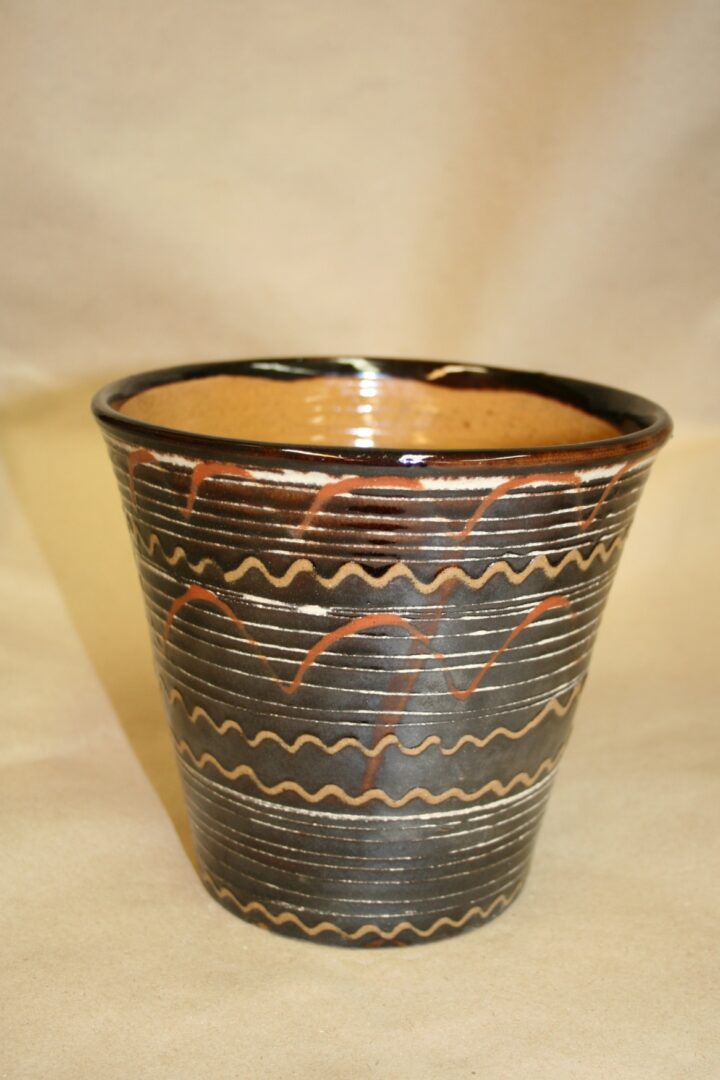 Ručne točený na hrnčiarskom kruhu, poliaty tmavohnedou až čiernou hlinkou maľovaná pomocou kukučky (rožka) bielou hlinkou a farebnýmí hlinkami geometrický a rastlinný dekor, transparentná bezfarebná glazúra.