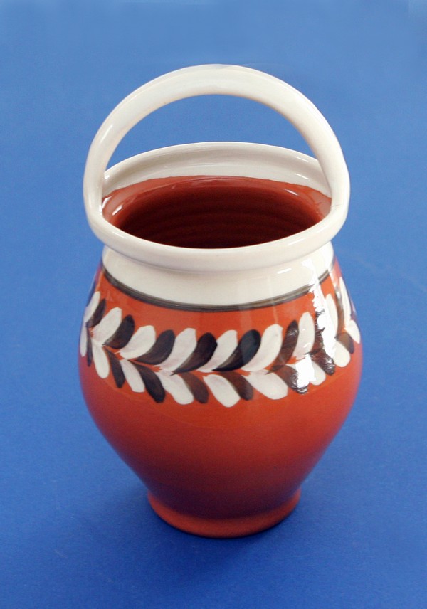 Ručne točený na hrnčiarskom kruhu, maľovaný lístkový dekor farebnými hlinkami dookola po obvode nádoby v hornej tretine, transparentná bezfarebná glazúra.