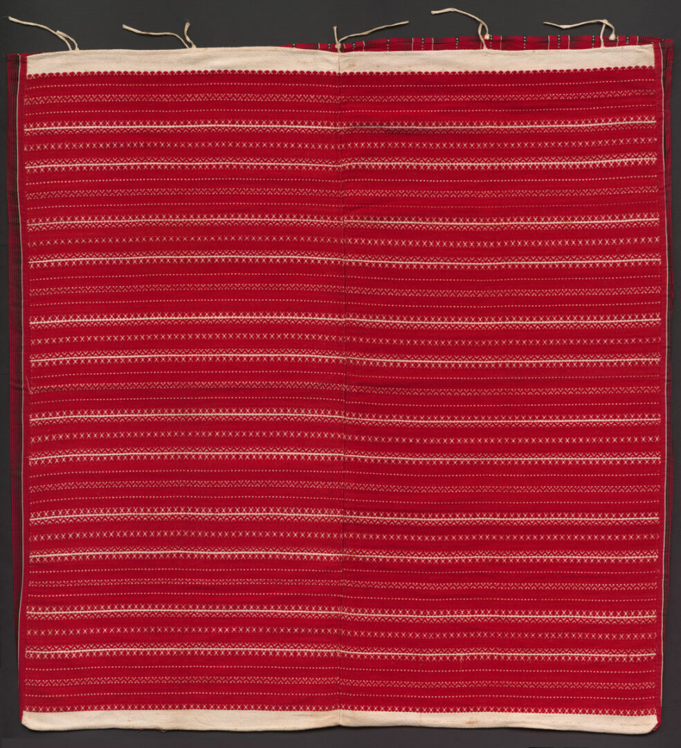 Obliečka na perinu tkaná keprovou väzbou. Zošitá z dvoch poly plátna, plynulo zdobená po celej ploche flotážovými pruhmi. Spodná časť obliečky je ušitá z potlačeného kartúnu. Obliečka je ručne zošitá, na strane kde je otvor na perinu, sú našité keprové šnúrky na uviazanie. techniky: keper, kockovanie.