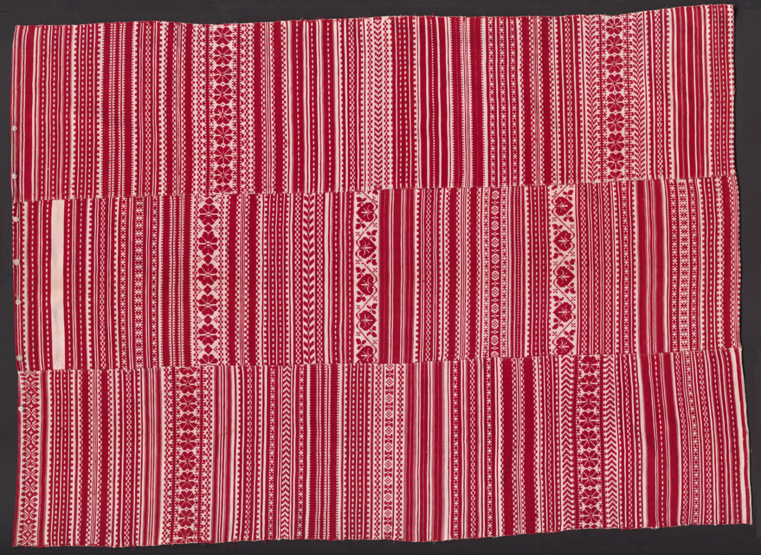 Vchrná strana obliečky na perinu, zošitá je z troch poly, osnovné aj útkové nite sú z bavlny. Základná väzba je keprová, červené vzorovacie pruhy sú robené keprovou väzbou, ripsovovu väzbou a preberaním. Zapínanie bolo na gombíky.
