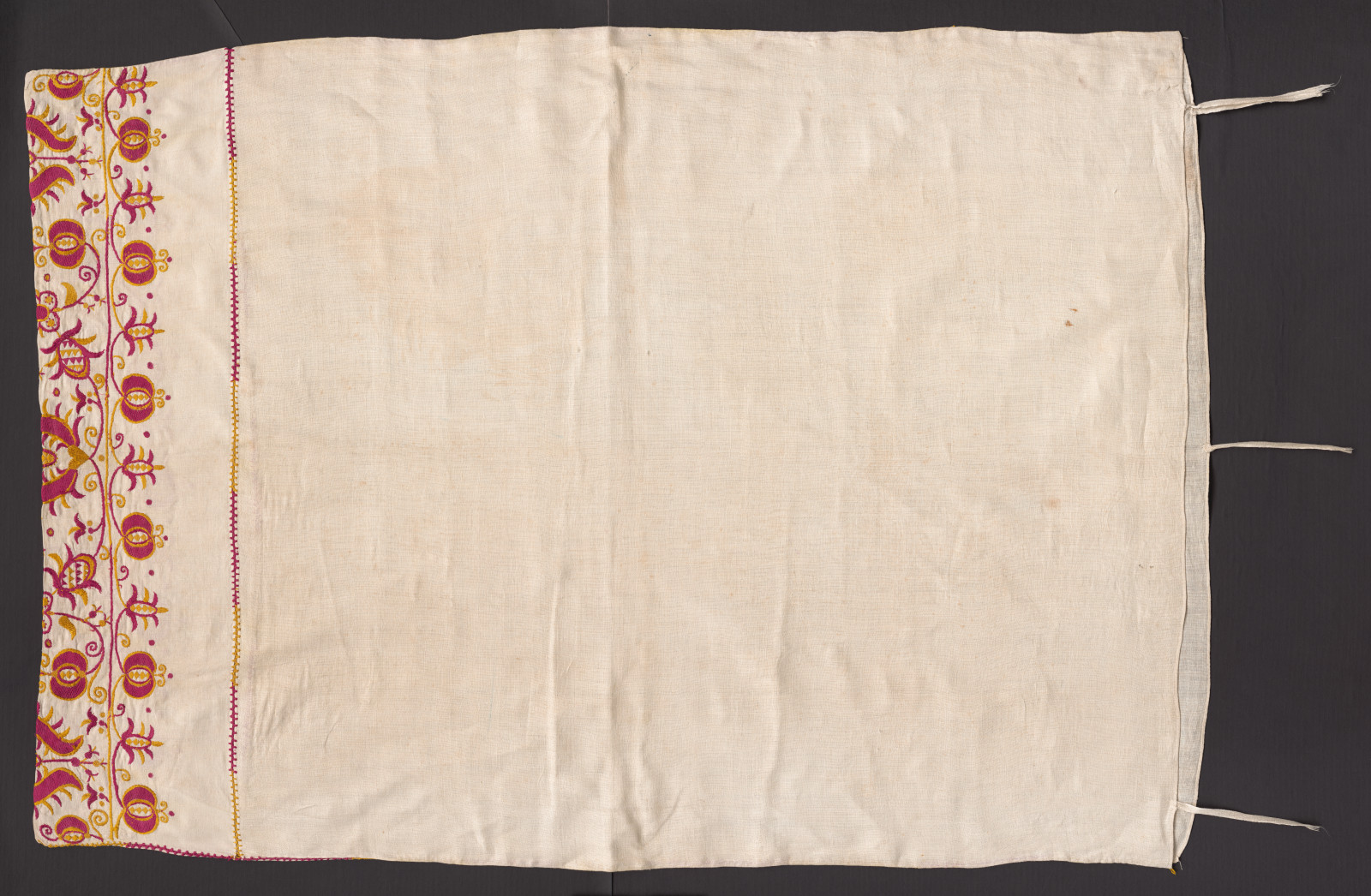 Obliečka na vankúš z ľanového plátna v štíte vyšívaná hodvábnymi niťami. Motív tvoria kvety a granátové jablká. Použité stehy sú plný, predný a stonkový. Obliečka a štít sú zošité ozdobným spojovacím švíkom. Na konci otvoru sú prišité keprové stužky. Lokalita: Prievidza.