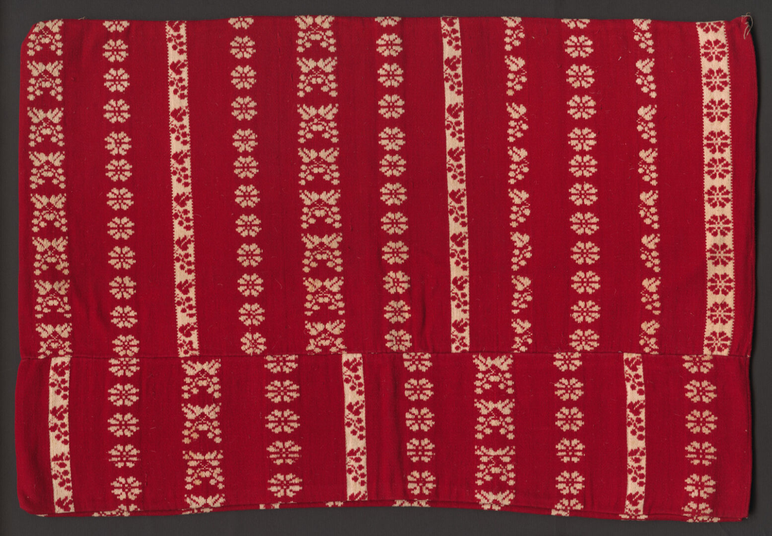 Obliečka na vankúš zošitá zo 4 dielov. Osnova je z bielych bavlnených nití, útok je tiež z bavlnených nití, pričom základna útková farba je červená a preberané motívy sú urobené bielou bavlnenou niťou v nasledovnom rytme: a b a c a b a c …. Obliečka je ručne zošitá.