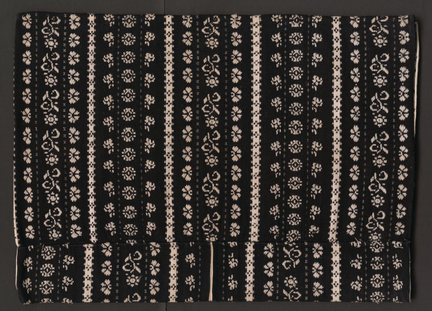 Obliečka na vankúš (3 diely) z bavlnenej ručne robenej tkaniny. Biela dvojpramenná osnova, čierny a biely jednopramenný útok. Väzba: keper, rips, preberanie. Motívy symetrické po jednej a dvoch osách symetrické.