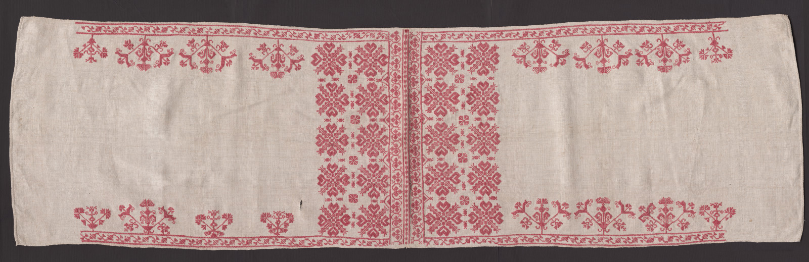 Obliečka na vankúš zhotovená z jednej šírky domáceho konopného plátna. Obliečka je po obvode a v strede v mieste ohybu vyšitá červenou bavlnkou rastlinnými motívmi. Použité techniky sú krížikový steh, vrkôčikový krížik a predný steh.