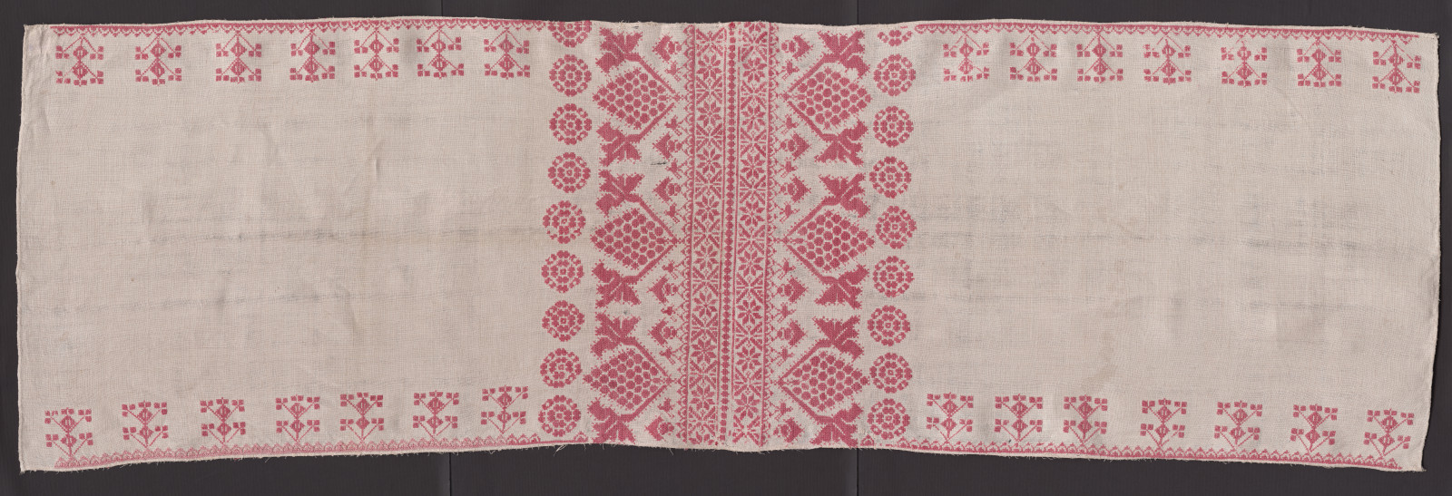 Obliečka na vankúš zhotovená z domáceho konopného plátna vyšívaná červenou bavlnou krížikovým a vrkôčikovým stehom. Hlavná výšivka s motívom hrozna je umiestnená v ohybe obliečky a štylizované rastlinné motívy sú umiestnené po obvode.