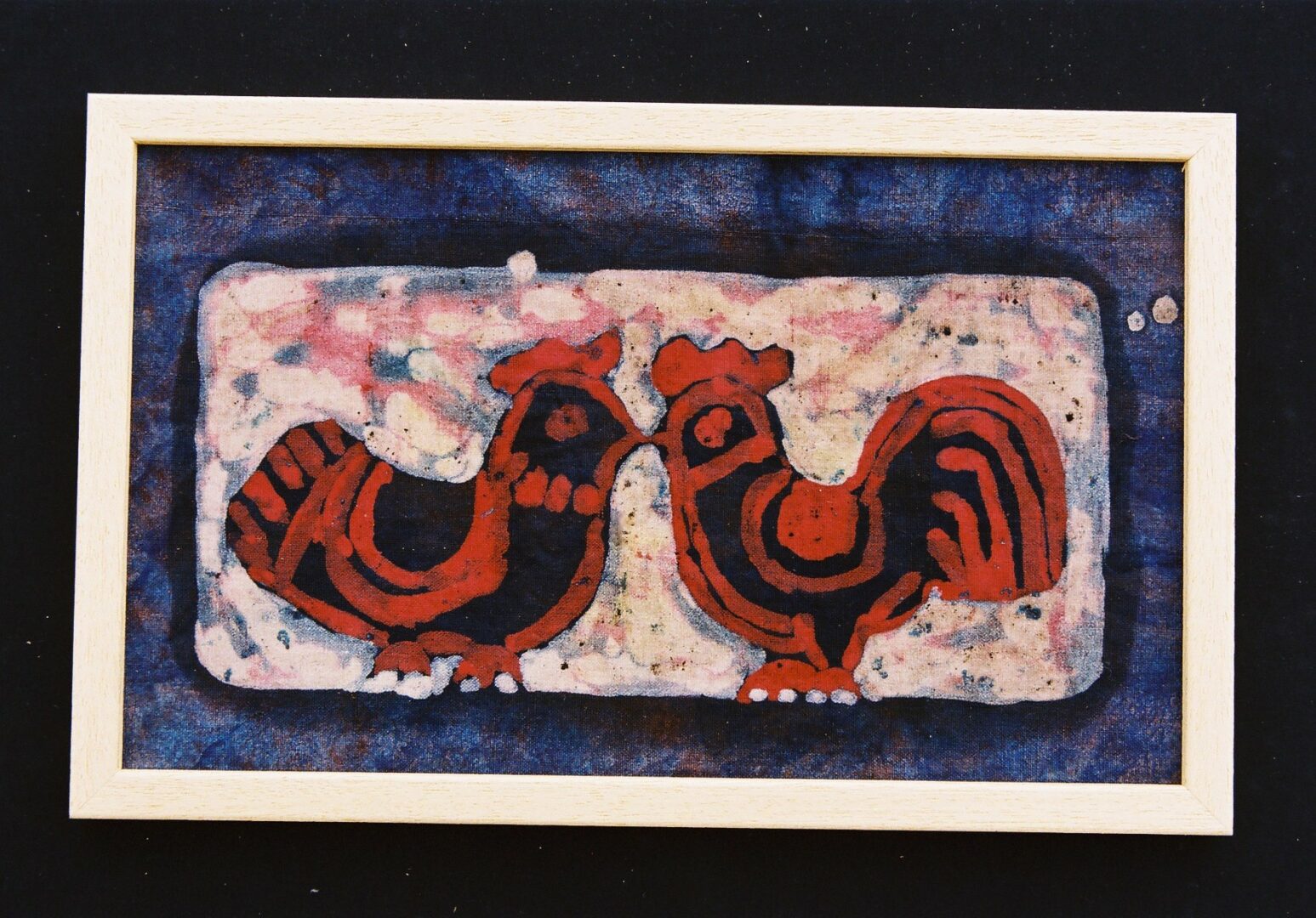 Motív obrázku je vytvorený batikovou technikou podľa dizajnu Jany Menkynovej a zarámovaný v drevenom ráme pod sklom.