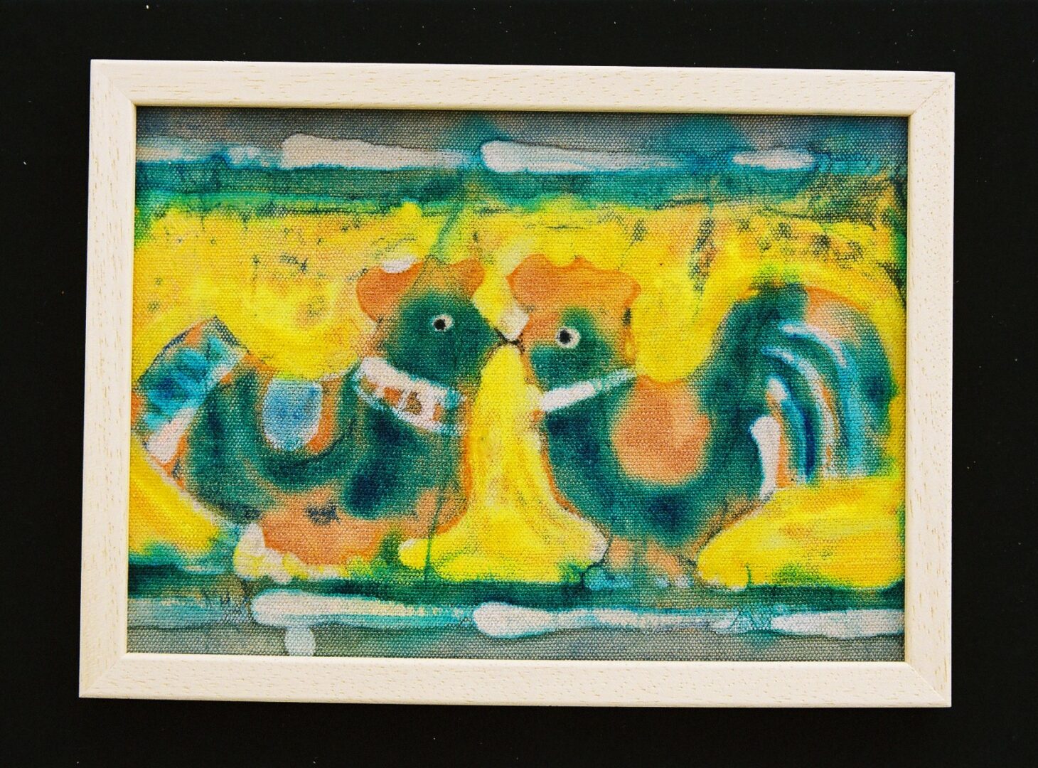 rozmery s rámom: cca15x24cm = 0965140011 Kohút a sliepka I., cca20x31cm = 0965140012 Kohút a sliepka II., cca23x40cm = 0965140013 Kohút a sliepka III.,