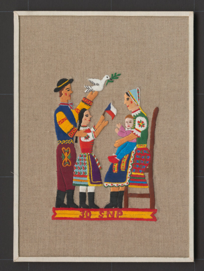 Figurálna výšivka s motívom rodiny zarámovaná v pasparte. Výšivka je šitá plným plochým, stonkovým a retiazkovým stehom farebnými mulinkami.