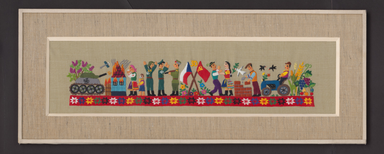 Figurálna výšivka s motívom vojny na ľavej strane a s motívom sposperujúcej spoločnosti na pravej strane. Výšivka je šitá plným plochým, stonkovým a retiazkovým stehom farebnými mulinkami.