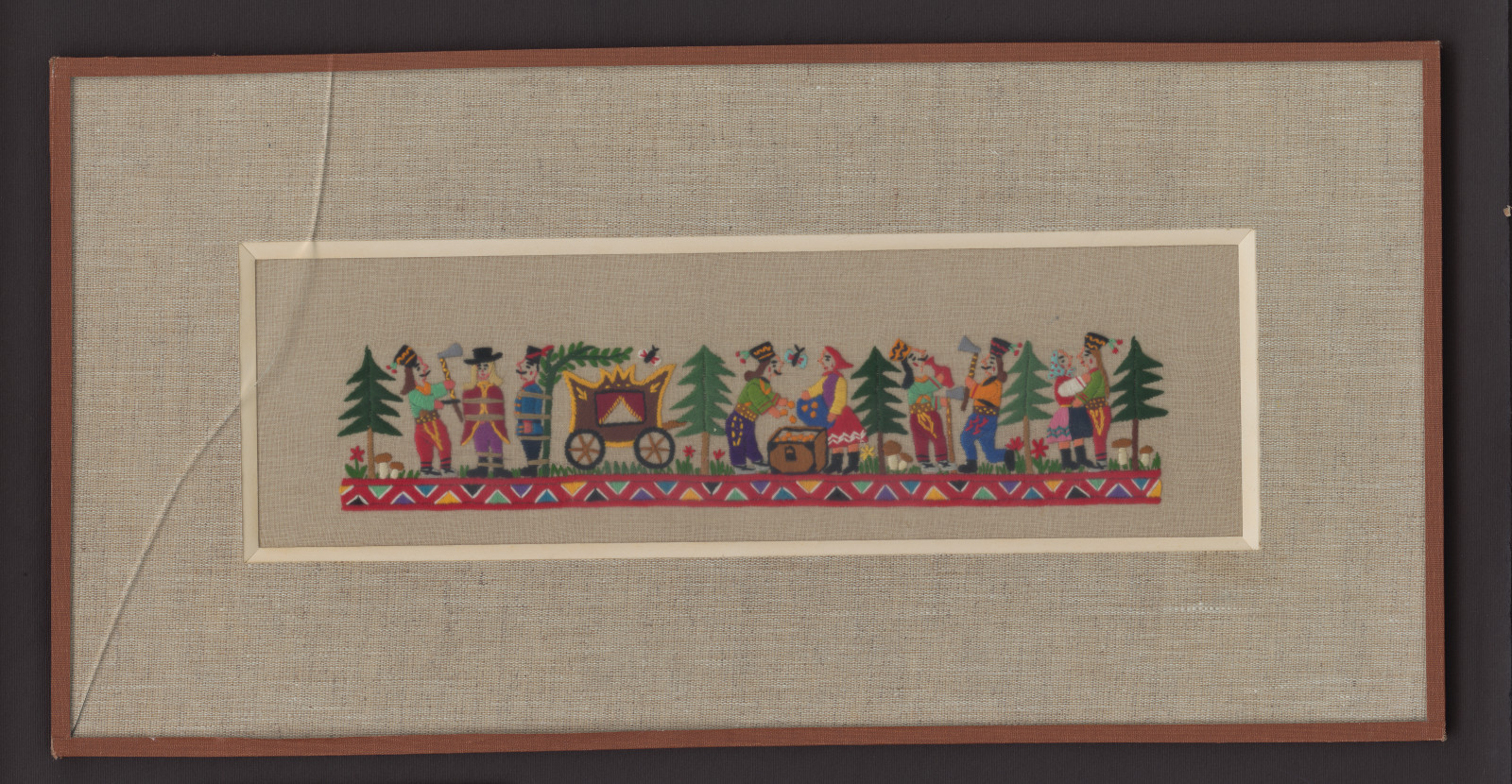 Figurálna výšivka zhotovená z pestrofarebných bavlnených nití. Výšivka je vyšitá plochým stehom na ľanovom plátne. Motív znázorňuje Jánošikovú družinu.