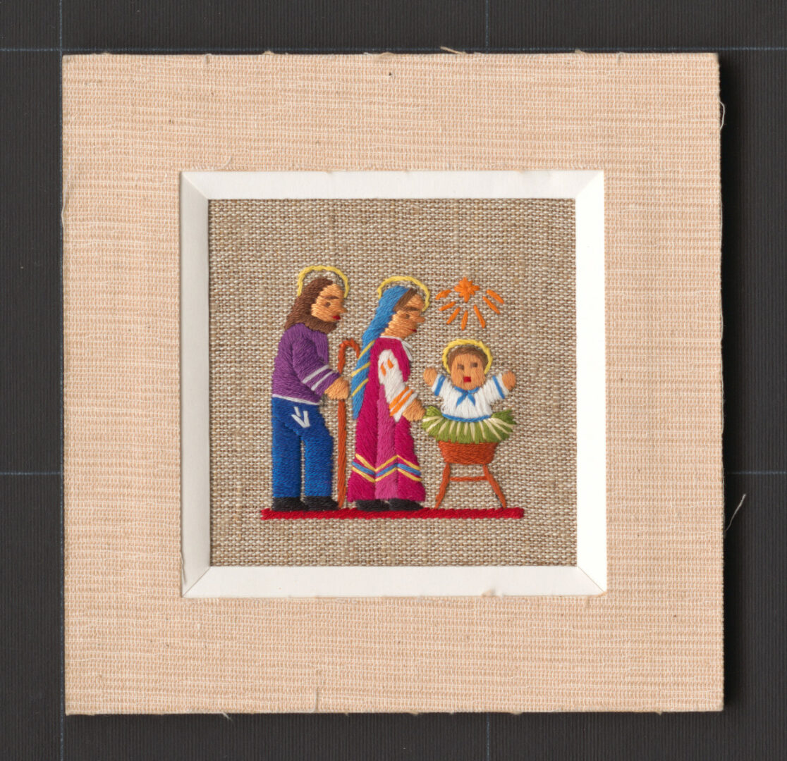 Figurálna pestrofarebná výšivka vyšívaná plným stehom na ľanovom plátne. Motív svätá rodina. Lokalita: Šoporňa