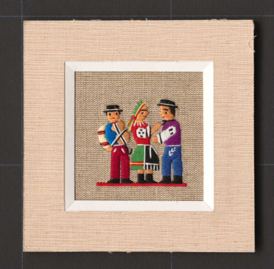 Figurálna výšivka vyšívaná plným stehom na ľanovom plátne. Motív svadby. Výšivka je vložená do papierovej pasparty. Lokalita: Šoporňa