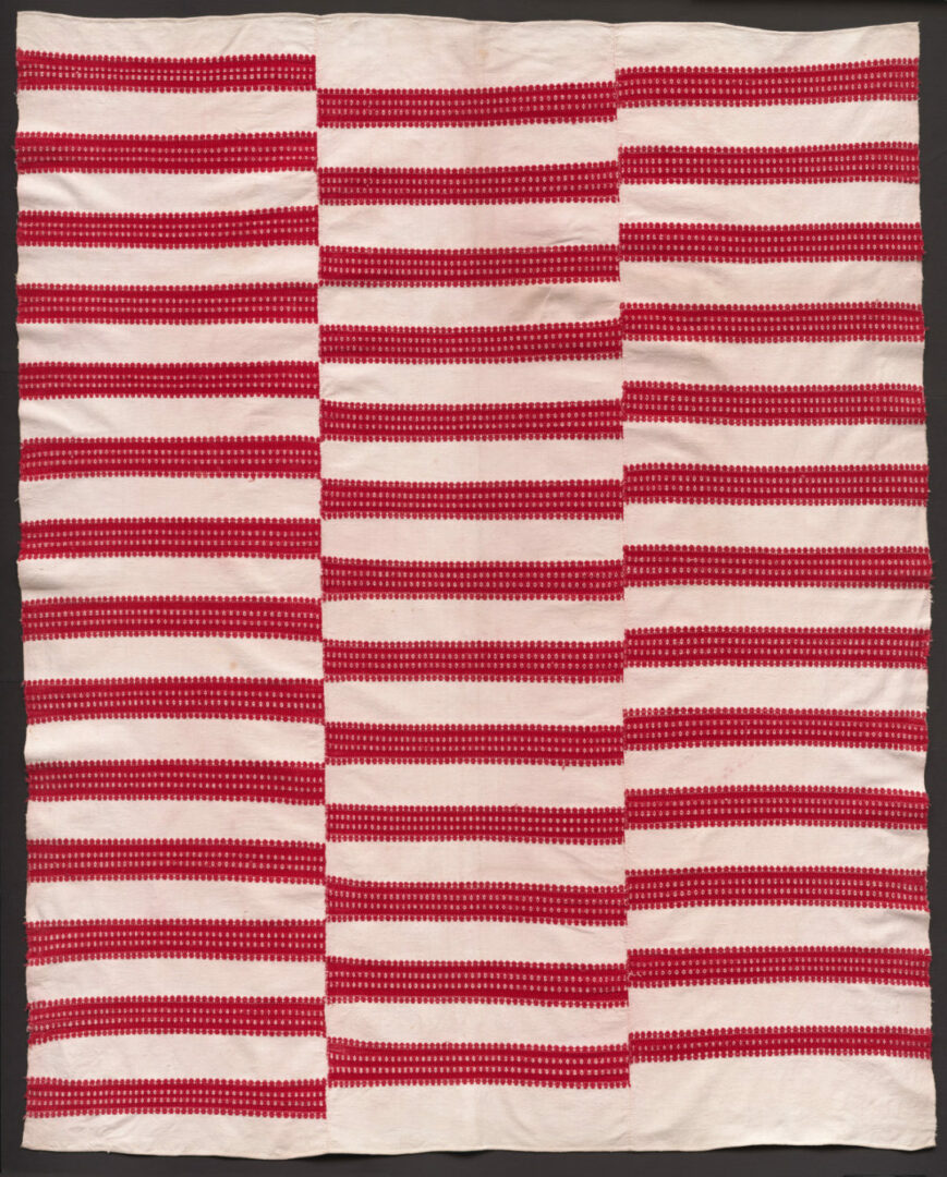 Obrus zošitý z troch častí, tkaný plátnovou väzbou, po celej ploche zdobený pruhmi pretkávanými ripsovou väzbou v červenej farbe.