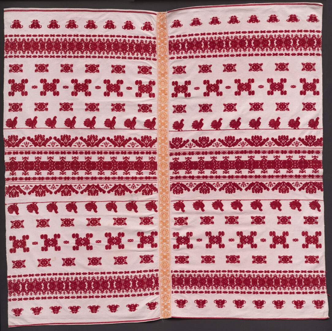 Obrus zhotovený z dvoch pôl bavlneného plátna. Obe poly sú spojené kupovanou strojovou tkanicou s oranžovými geometrickými vzormi. Po celej šírke a dĺžke sú na obruse preberané rastlinné a živočíšne motívy, vzorovacia niť je červená. Okrem preberenia je na tkanine použitý rips, kockovanie a rešetkovanie (pik).