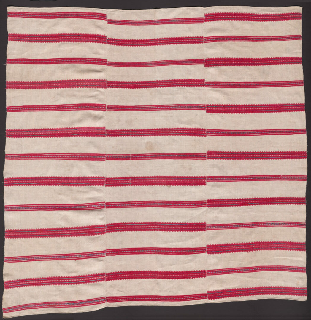 Trojdielny obrus štvorcového tvaru. Osnovné nite sú z konope, útkové nite sú z konope a bavlny. V plátnovej väzbe sa striedajú užšie a širšie červeno-modro-biele ripsové pásy s preberaním.