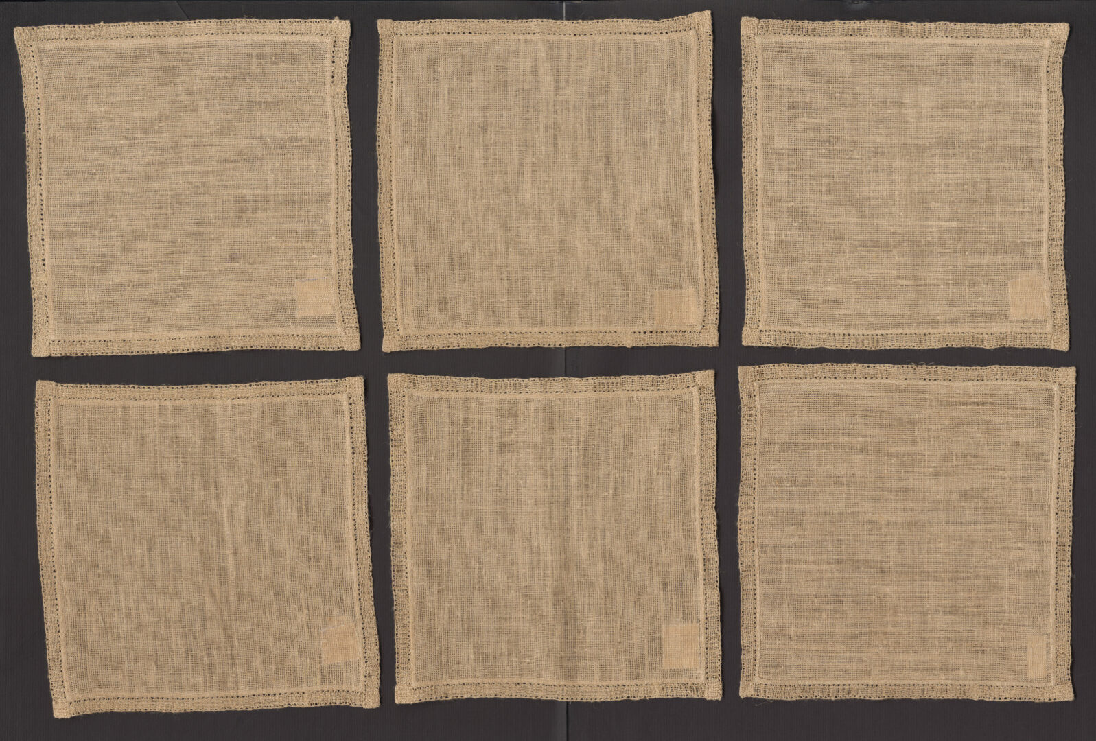 Súprava obrus a prestierania 1 + 6 kusov. Vyrobené sú z konopného plátna zdobené učňovskými plátenkovými pásmi z konopných nití. Plátno tkané pre spolok v Štátnom ústave pre zveľaďovanie živností v Martine.