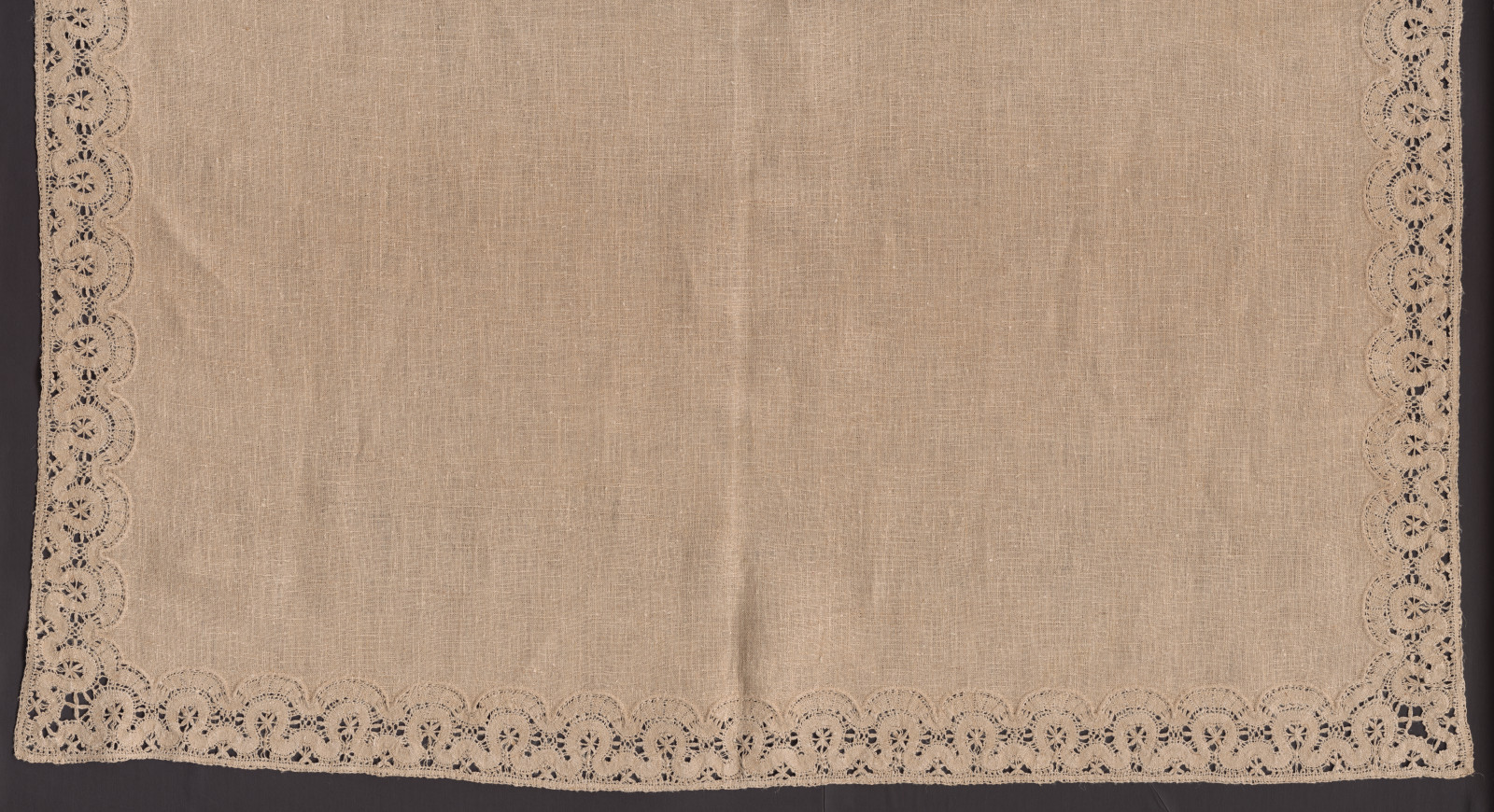 Konopný obrus s čipkou. Čipkový okolok pásikového typu, motív západoslovenský. Krásny exemplár čipky „krajcového“ typu. Väzby pletence, plátenko, lístky. Vyrobenév štátnej čipkárske dielne v Hodruši.