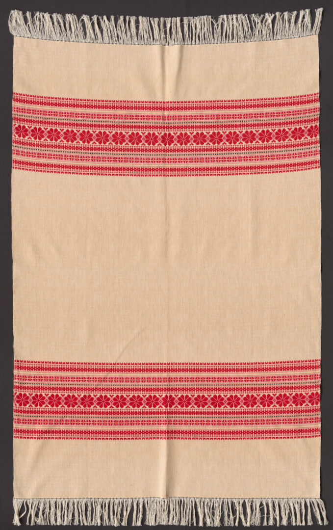 Obrus tkaný, osnovné aj útkové nite sú z bavlny, v základnej plátnovej väzbe sú na okrajoch vzory tkané preberaním a kockovaním, na koncoch sú naviazané dlhé strapce krémovej farby.