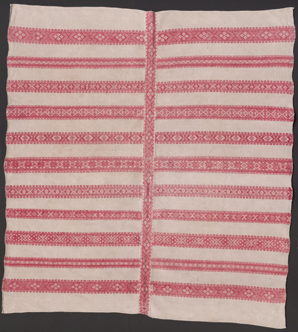 Obrus z domáceho konopného plátna tkaný keprovou väzbou „pšeničkový drelich“. Dve poly sú spojené doma tkanou tkanicou, ktorá je tiež z konopnej priadze preberaná červenou bavlnenou priadzou. Obrus je zdobený flotážou – preberaním z červenej bavlnenej priadze. Preberané pruhy s rôzmymi geometrickými motívmi pokrývajú celú plochu obrusa.
