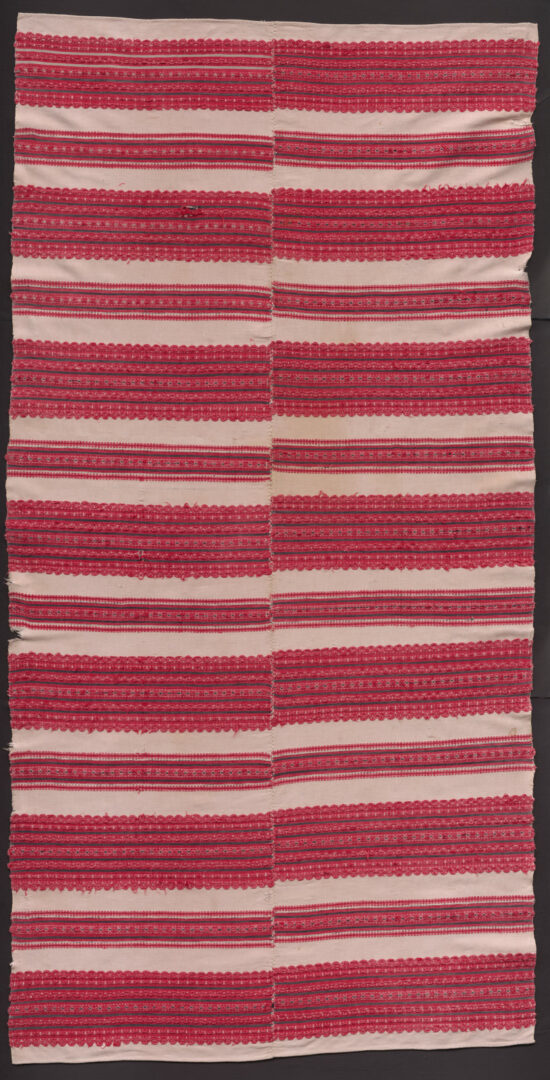 Obrus, dvojdielny, osnovné nite sú z bielej bavlny, útkové nite sú z bielej, červenej a čiernej bavlny. Základná väzba je plátnová, vzorovanie je robené v pásoch ripsovou väzbou a kockovaním. Motív pásov je striedavý (a b a b)