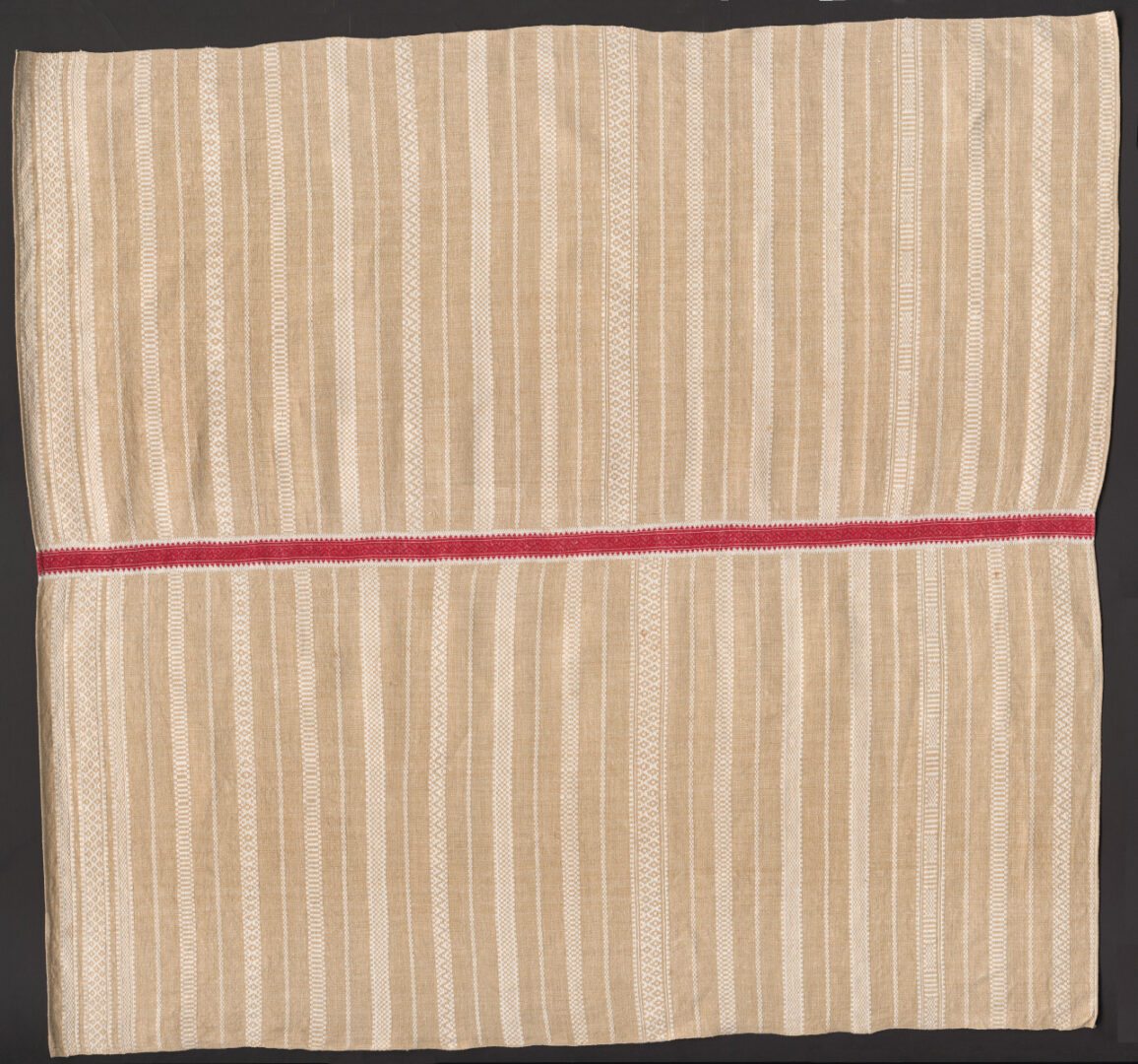 Obrus dvojdielny zošitý červenou kúpenou tkanicou. Osnovné nite sú z konope, útkové nite sú z konope a z bielej bavlny. Väzba je plátnová s kockovaním, vzory sa striedajú v širších a úžších pásoch po celej ploche obrusu.