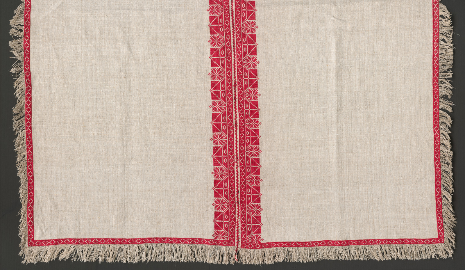 Tkaný obrus, 2 poly konopného plátna spojené spojovacím švíkom, okolo obrusa a v strede červená výšivka krížikovým a vrkôčikovým stehom, okolo celého obrusa strapce.