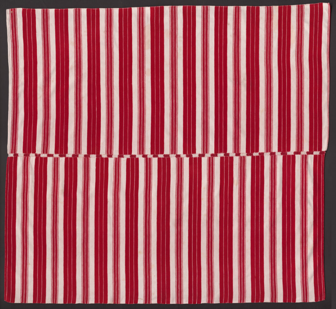 Tkaný obrus – základný materiál je bavlna bielej a červenej farby. Vzor tvoria pásy, ktoré sa pravidelne striedajú podľa osi súmernosti v striedavom rytme a b a b. Obrus má dve poly spojené ozdobným spojovacím švíkom zhotoveným z červenej a bielej bavlny.