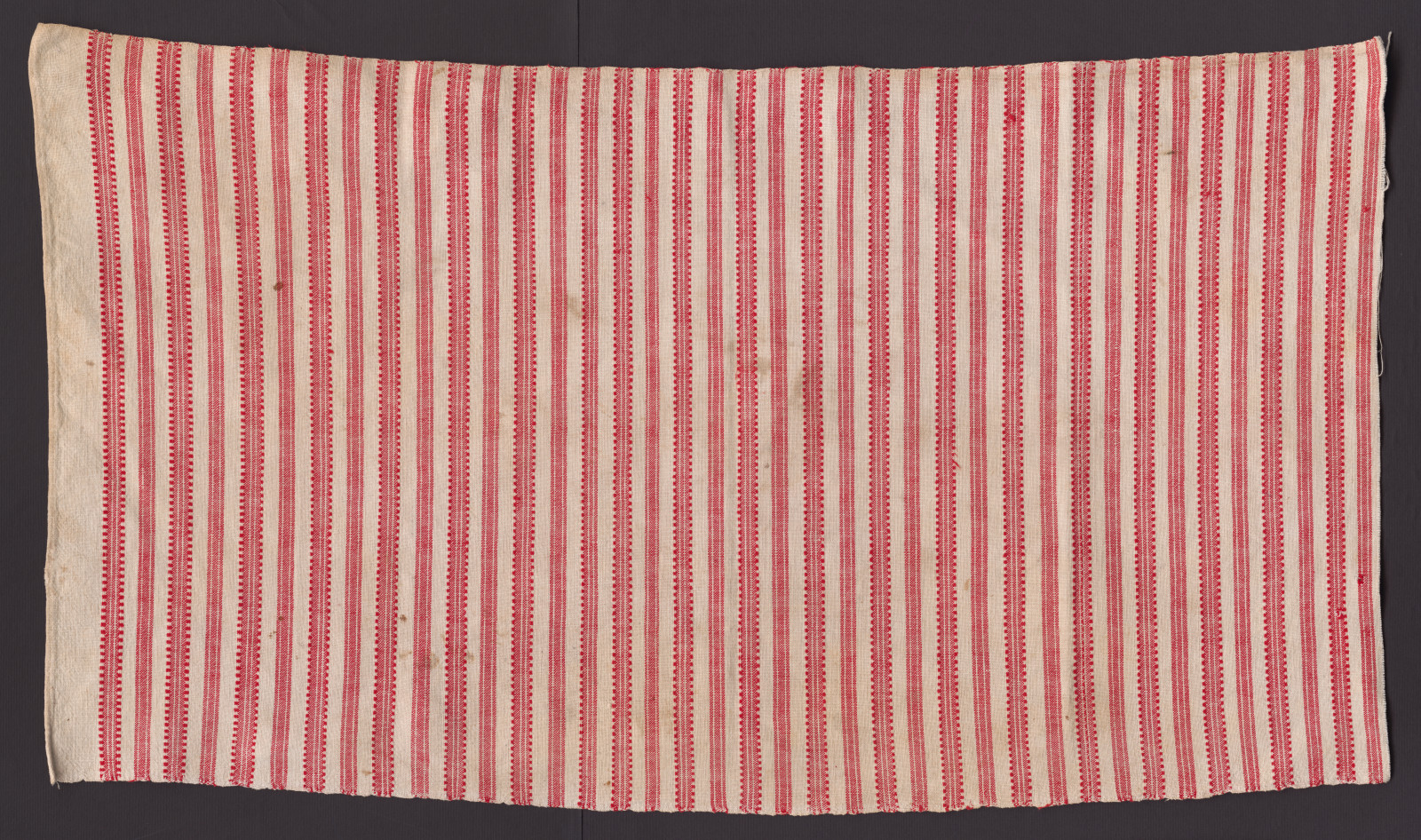 Časť obrusa – jedna pola, nie celá. Osnovné aj útkové nite sú z bavlny, väzba je plátnová s kockovaním. Vzor tvoria úzke červené pásy s dvoma bielymi čiarkami, každý druhý pás má po okrajoch kockovanie červenou niťou. Pásy sa triedajú v rytme a b a b.