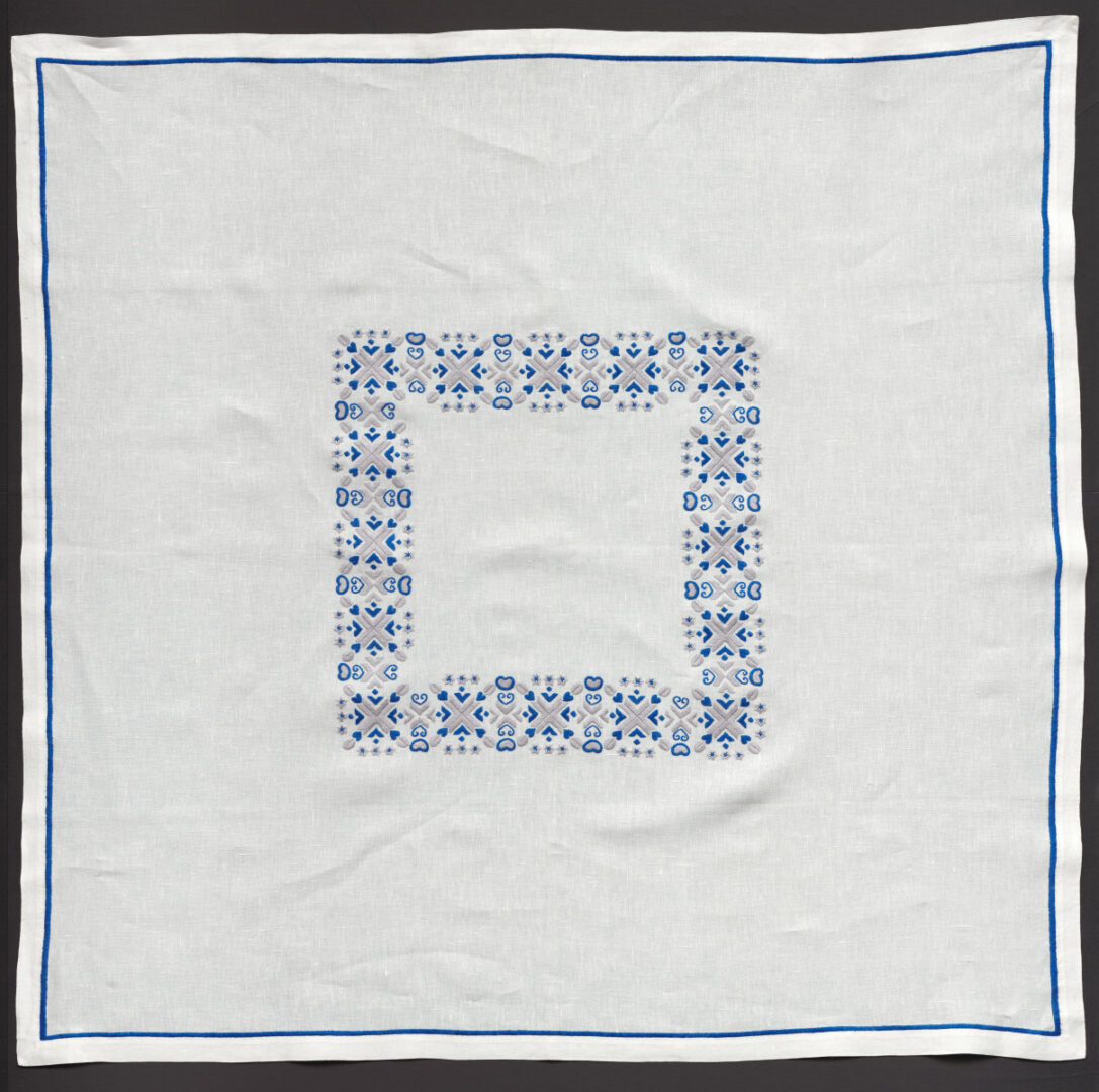 Obrus z ľanového plátna vyšívaný perlovkami vzor: oblasť Moravské Lieskové technika: hladkovanie autor návrhu: Jana Menkynová, 2001 vyšívala: Rita Tóthová, Bratislava