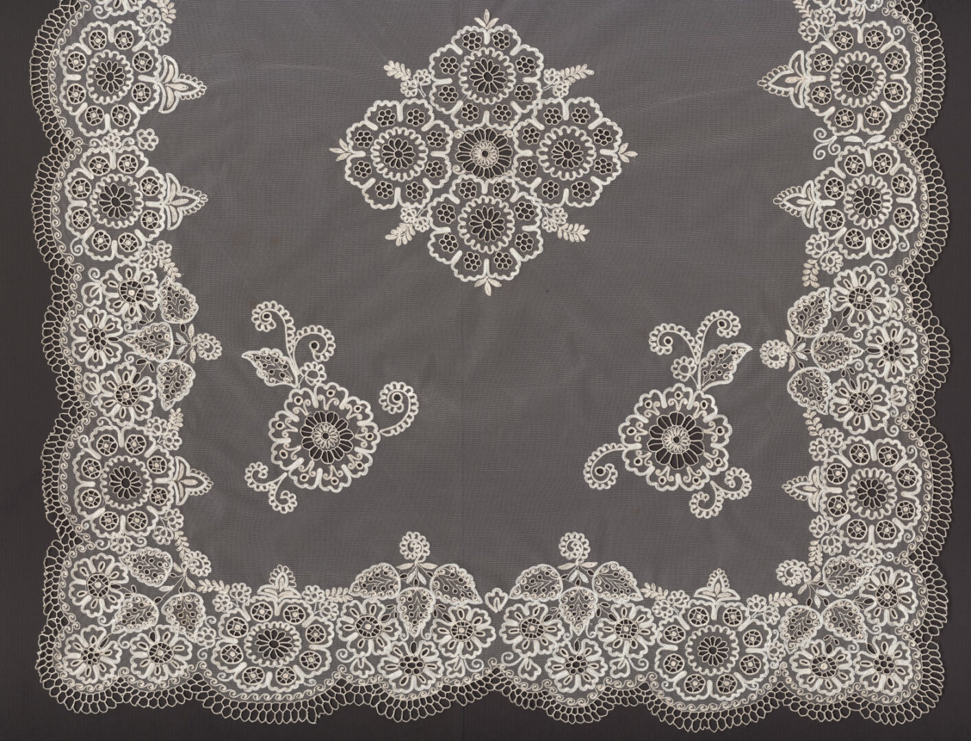 Prikrývka vyšívaná krivou ihlou na tyle. Motívy sú kvetinové prelamované. Výšivka je umiestnená po celom obvode, v rohoch a v prostriedku. Okraje obšité slučkovacím stehom. Lokalita Očová.