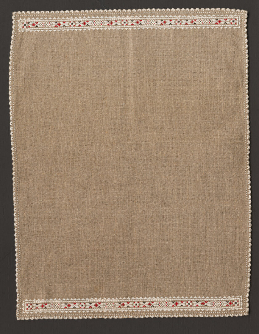 Základný materiál je ľanové nebielené plátno, na koncoch ozdobené počítanou výšivkou „na rybky“.