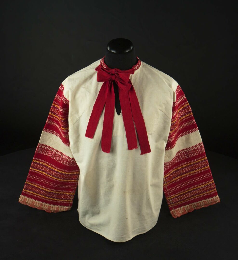 Drieková časť košele je z továrenského plátna, rukávy sú z ručne tkanej, farebne vytkávanej tkaniny. Na koncoch rukávov je našitá paličkovaná čipka, je z hrubšej bavlnenej priadze. Časť zakrývajúca plecia a rázporok je podšitá. Golierik je vyšitý krížikmi. Ku golieriku a pod ním je našitá široká červená keprovka, ktorou sa košeľa uväzovala.