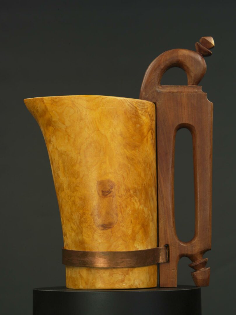 Odlievák svorový, korpus rezaný zo svoru, dno vsadené, spevnené jednou medenou nobručou, nasadené ucho prevyšujúce korpus je hore ukončené rezanou hlavou hada s korunou.
