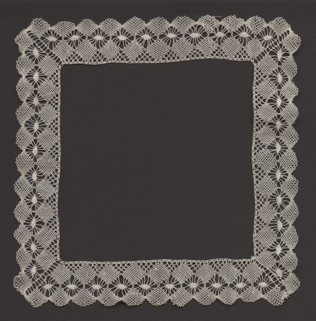 Paličkovaný okolok. Materiál biela bavlnená niť na šitie, väzby jedno a dvojpárové pletence, plátenko, polpára, dierky, pavúčiky.