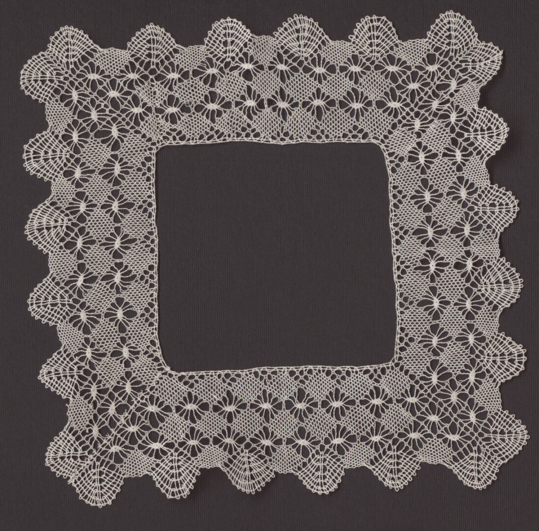 Paličkovaný okolok na vreckovku. Špaňodolinský banícky motív. Väzby plátenko prekladané, pavúčky, dierky a jednopárové pletence.