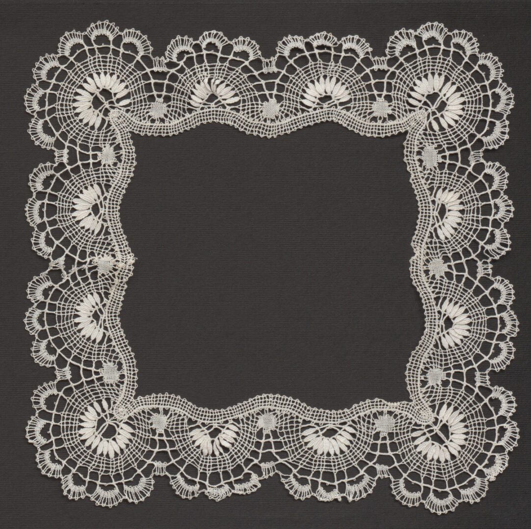 Okolok z paličkovanej čipky. Materiál biela bavlnená niť na šitie, väzby jedno a dvojpárové pletence, plátenko hladké a prekladané, lístky a mitky. Vnútorný aj vonkajší okraj je upravený do vlnovky.