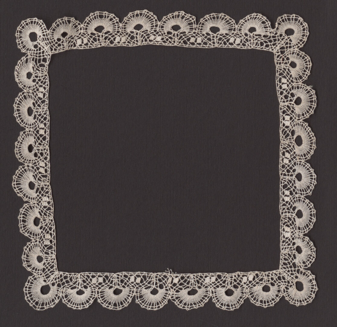 Paličkovaný okolok pásikového charakteru na vreckovku. Materiál biela bavlnená niť na šitie, väzby pletence, plátenko, dierky, ploštičky, oká.