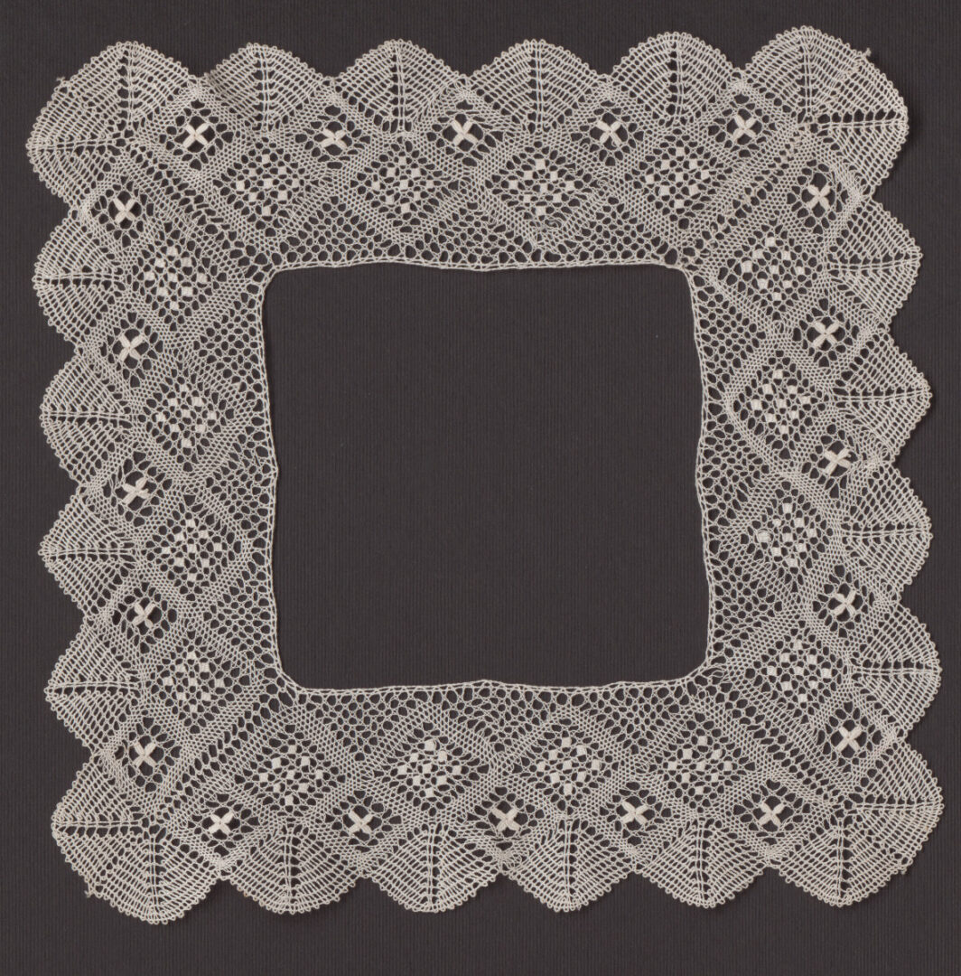 Paličkovaný okolok na vreckovaku. Materiál biela bavlnená niť, väzby plátenko prekladané, polpára, dierky, plostičky, lístky.