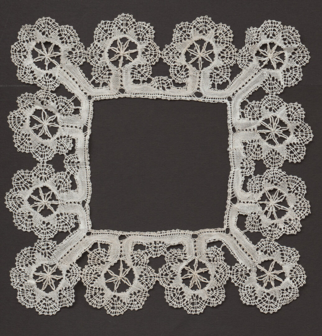 Paličkovaný okolok, vzor starohorský. Materiál biele bavlnené nie na šitie, väzby plátenko hladké a prekladané, dvojpárové pletence a pikotky/mitky.