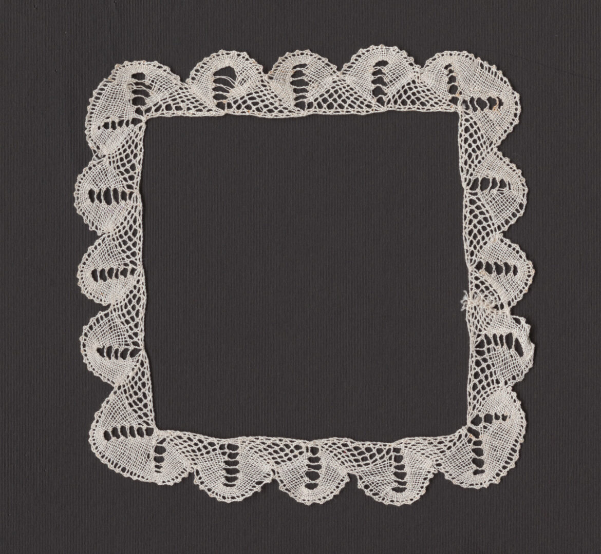 Paličkovaný okolok na prikrývku. Materiál biela bavlnená niť na šitie, väzby dierky, plátenko, jednopárový pletenec. Motív je starohorský v soľnobanskej predstave.